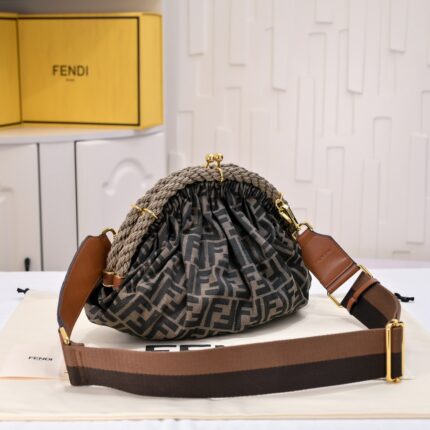 Equipped with an adjustable long shoulder strap. ⛓️ Chain +30. Model 7739. The Fendi Shell cloud bag is finally here. Once it comes out, it is bound to be a blockbuster. It is woven from double-F canvas letter material. The soft shape is matched with a semicircular metal buckle, and the latter is decorated with a waxed rope pattern twisted ring. It has a lined inner compartment, a small flat pocket and gold metal parts. It can be held by hand, and two internal hooks can be used to fix the shoulder strap. Size: 42✖️21✖️15cm.