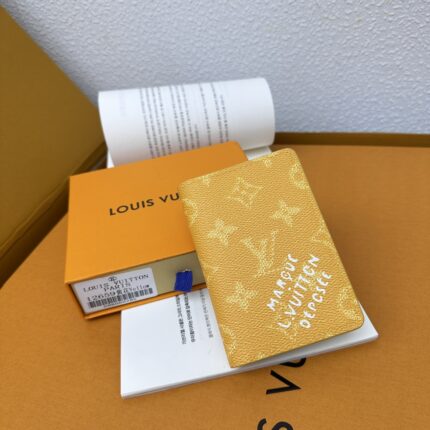 M12659 Yellow! Pocket wallet. This pocket wallet is made of Monogram Heritage coated canvas. It incorporates classic elements such as the vertical and horizontal textures of Damier check and the Marque L.Vuitton Déposée logo, showing Pharrell Williams' modern interpretation of the Monogram pattern. 11.x 7.5