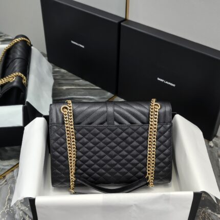 Medium size, Envelope# black with gold buckle. Medium-sized grained embossed quilted genuine leather envelope bag. Classic is eternal. The V pattern combined with rhombus pattern and caviar texture is extremely beautiful. Italian cowhide with a conspicuous Y family logo, integrating elegance and fashion. One chain with three ways to carry: single-chain crossbody, double-chain single-shoulder, and single-chain single-shoulder are all perfect. For fairies of different heights, there is always a carrying method suitable for you. Oh no, it's the feeling of being enchanted! Model: 48722. Size: 24x17.5x6cm.