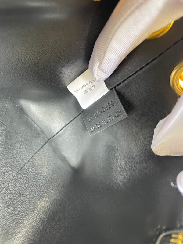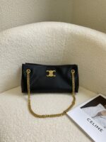 The newly released Victoire chain bag is crafted with textured leather to create a square silhouette and is paired with a golden sliding chain shoulder strap, exuding the style of a Tomboy cool girl. Another Tily handbag features a playful crescent silhouette that sets off the Triomphe emblem, revealing the sweet charm of a girl next door. The Triopmhe metal Triomphe emblem remains the visual focus. The newly released Victoire chain bag uses textured calfskin to create a soft bag shape, replacing the hard and sharp line structure, making it more relaxed and friendly. The metal sliding chain shoulder strap can achieve different styles such as shoulder carrying and crossbody carrying. The bag can freely switch between casual and formal scenes. Style number: 810524 Size: 9X6X3 inches (23.5X14X8 cm). Crossbody and shoulder carry. TRIOMPHE snap closure. 2 main compartments and 1 inner flat pocket. Sliding chain.