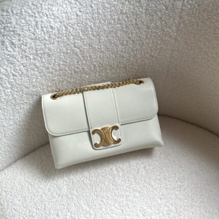 The newly released Victoire chain bag is crafted with textured leather to create a square silhouette and is paired with a golden sliding chain shoulder strap, exuding the style of a Tomboy cool girl. Another Tily handbag features a playful crescent silhouette that sets off the Triomphe emblem, revealing the sweet charm of a girl next door. The Triopmhe metal Triomphe emblem remains the visual focus. The newly released Victoire chain bag uses textured calfskin to create a soft bag shape, replacing the hard and sharp line structure, making it more relaxed and friendly. The metal sliding chain shoulder strap can achieve different styles such as shoulder carrying and crossbody carrying. The bag can freely switch between casual and formal scenes. Style number: 810524 Size: 9X6X3 inches (23.5X14X8 cm). Crossbody and shoulder carry. TRIOMPHE snap closure. 2 main compartments and 1 inner flat pocket. Sliding chain.