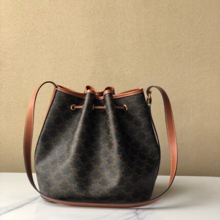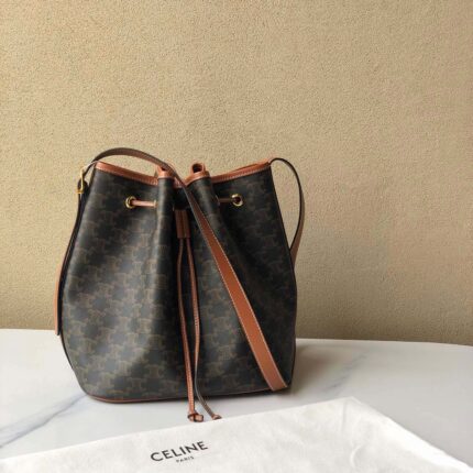 👑CELINE medium TRIOMPHE canvas drawstring bag, vintage crossbody. With internal label. 61% coated canvas, 39% calfskin. Crossbody and shoulder carry. Drawstring genuine leather strap. Adjustable leather shoulder strap. Length 50cm. Size: 24X27X19cm.