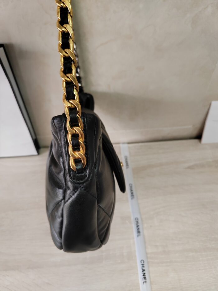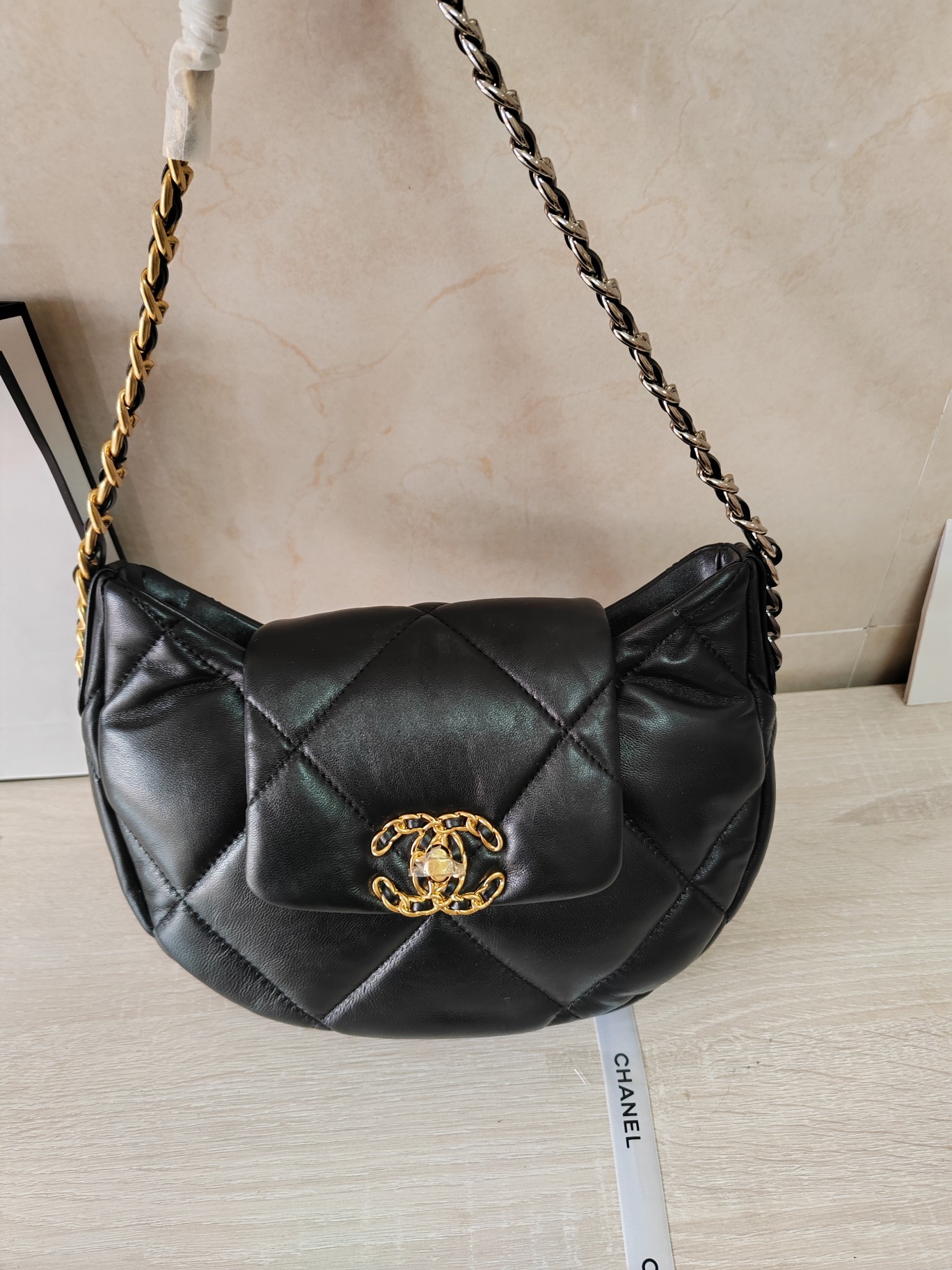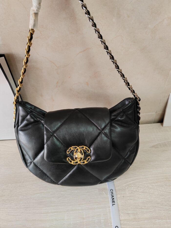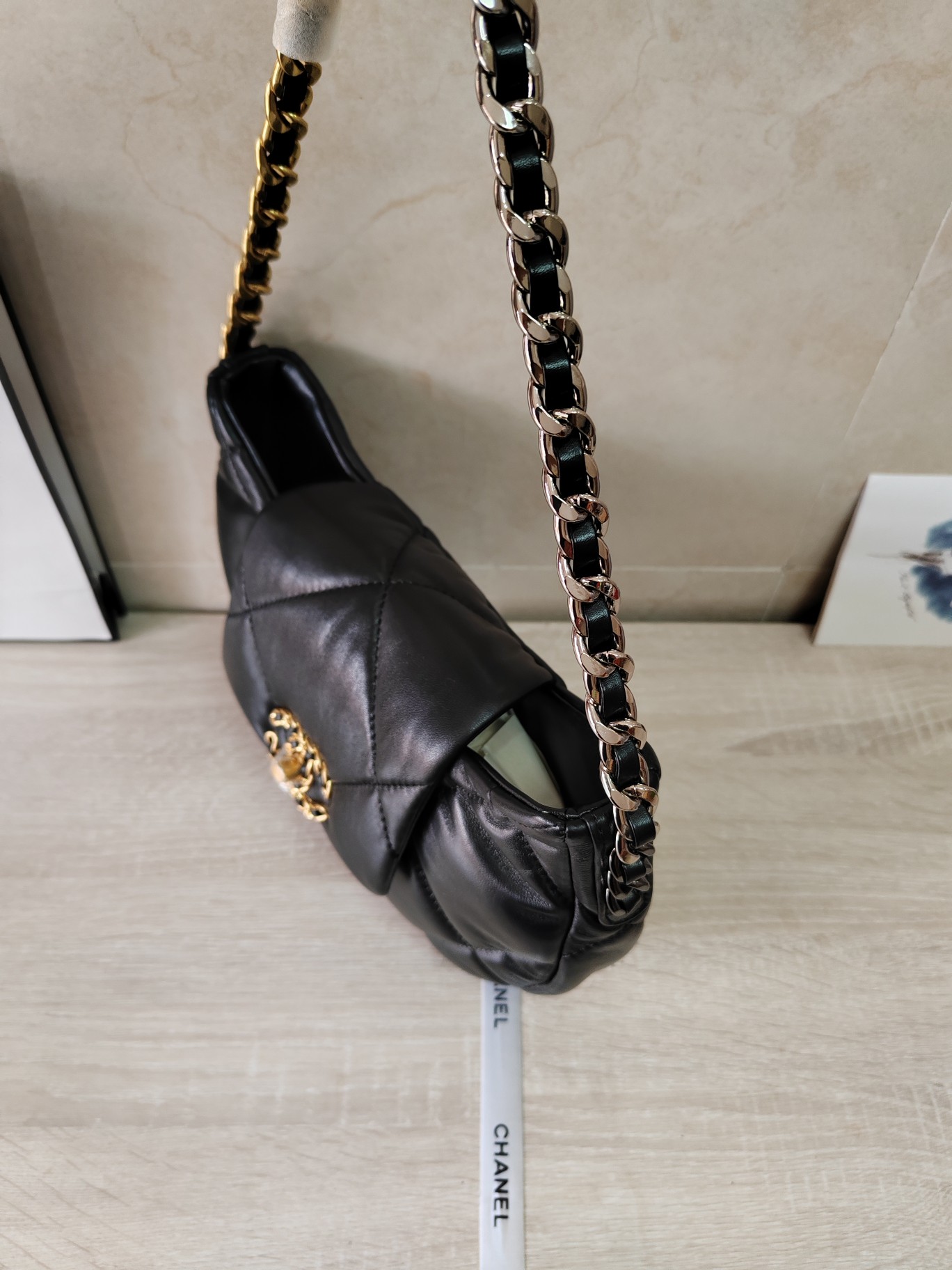 24c 19 underarm bag! Chubby pumpkin-shaped design, large diamond pattern, and comfort elements are newly interpreted. Color-blocked leather-threaded chain + leather upper chain shoulder strap, designed with the classic double C logo, is the personalized style design of the Chanel 19 handbag. The overall soft bag body design feels more casual and is lighter in weight. Versatile and practical good bag.