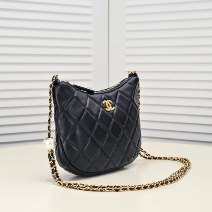 CHANEL 24S pearl-adjustable buckle hobo bag. Delicate and plump sheepskin continues the previous classic shape. The pearls are changed. The chain has a double-pearl adjustable design, which is more novel and unique. There is also a small double C embedded on the pearl ball. It is simple, atmospheric and very delicate! Size: 23.5*17*6 cm. Model number: 9038.