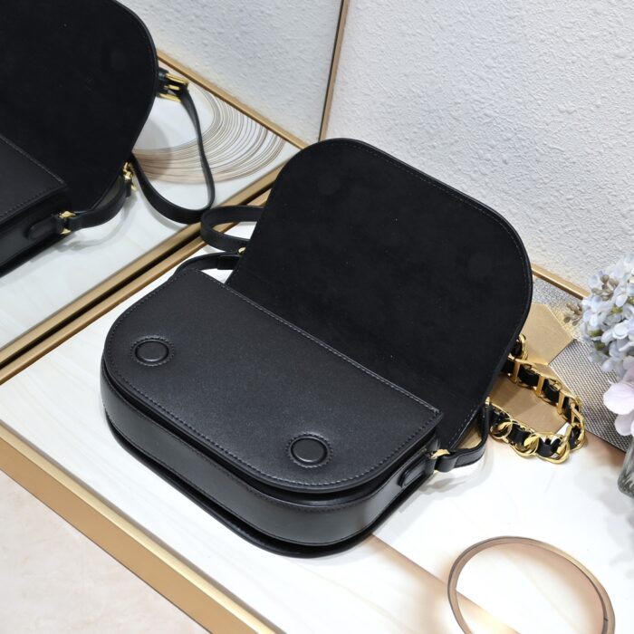 The latest Signature series combines modern style and elegant charm. It is carefully crafted from black cowhide leather. The front is decorated with a unique large logo embossed mark. It is matched with a chain shoulder strap made of intertwined letter logo chain links and leather, full of high-end feeling. Size: 21*6*12cm.
