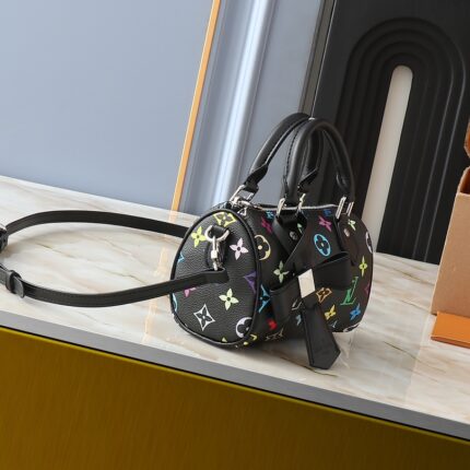 Upgrade the original M13391 M13406 M81085 LV x Takashi Murakami Nanospeedy bag. This Nano Speedy bag combines Monogram canvas with leather trim prints, featuring 33 vibrant colors in white, black, and red tri-colors. It has become a global hit, beloved by celebrities and influencers. Dimensions: 16x10x7.5 cm.