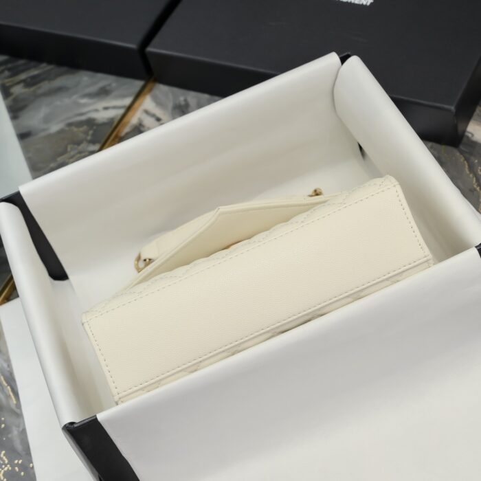 Small size. Envelope# white with gold buckle. Small grained embossed quilted genuine leather envelope bag. Classics are eternal. The V-pattern combined with rhombus pattern of caviar texture is extremely beautiful. It is very wear-resistant. Italian cowhide with a striking Y logo, embodying both elegance and fashion. It is very versatile. The small size has a large capacity. Looking at its side, you can tell it can hold a lot. Model: 52620. Size: 21x13x6cm.
