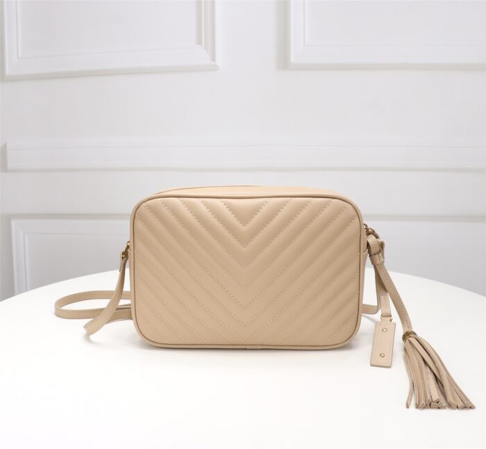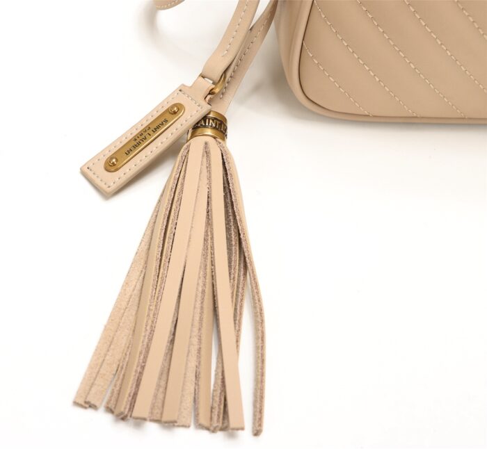 Cowhide with box. Saint Laurent camera bag, very delicate! Adjustable shoulder strap with stylish tassel pendant! Satin lining! There is an inner insert pocket in the bag! Very practical and elegant! Size: 23x16x6cm.